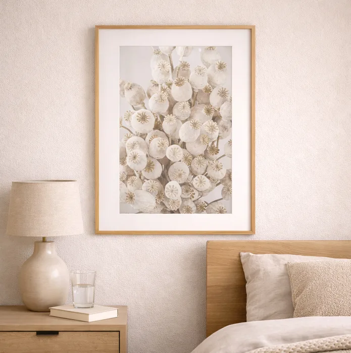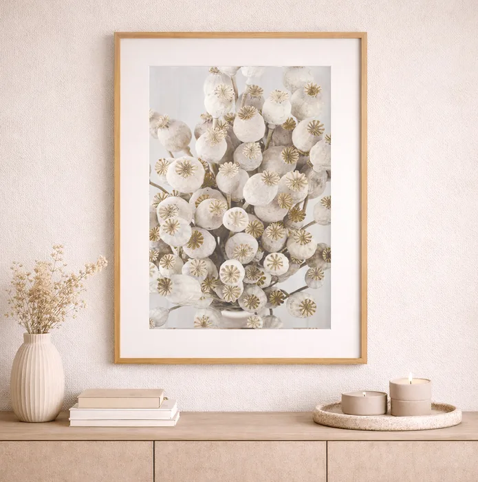 המציגה את תרמילי פרג מיובשים בגוונים נעימים ורכים.