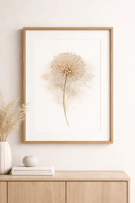 המציגה צמח בר מיובש על רקע בצבעי מים בגווני בז' טבעיים ורכים.