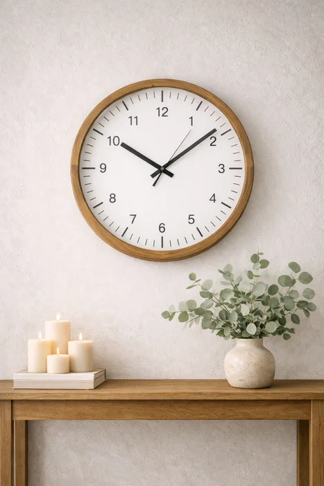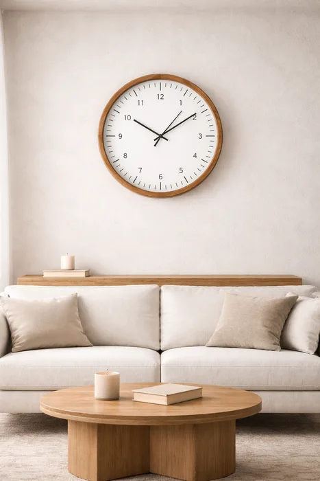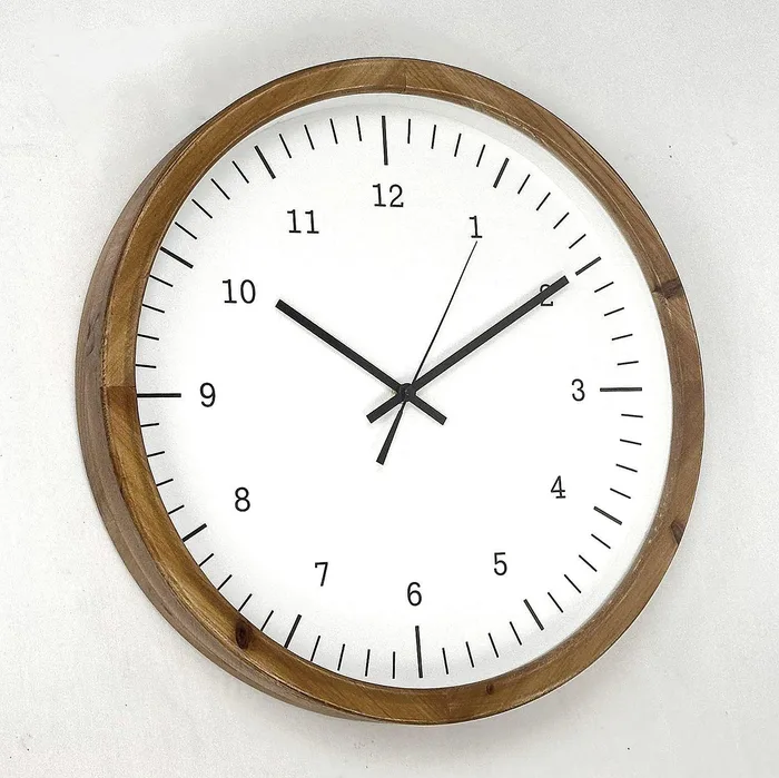 שעון קיר אלגנטי בקוטר מרשים, במסגרת עץ טבעי בגוון חמים ובפנים לבן נקי עם ספרות שחורות דקות ומדויקות.