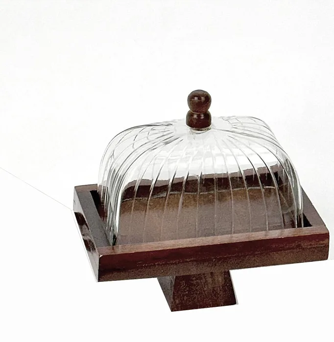 הגישו קינוחים עם סטייל! כלי עץ מלבני כולל כיפת זכוכית שקופה עם ידית עץ,