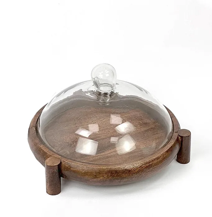 צלחת עץ עגולה עם כיפת זכוכית בעיצוב אלגנטי, מושלמת לאירוח מוקפד.