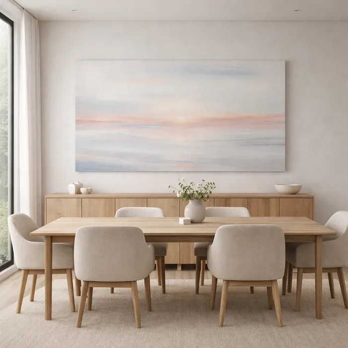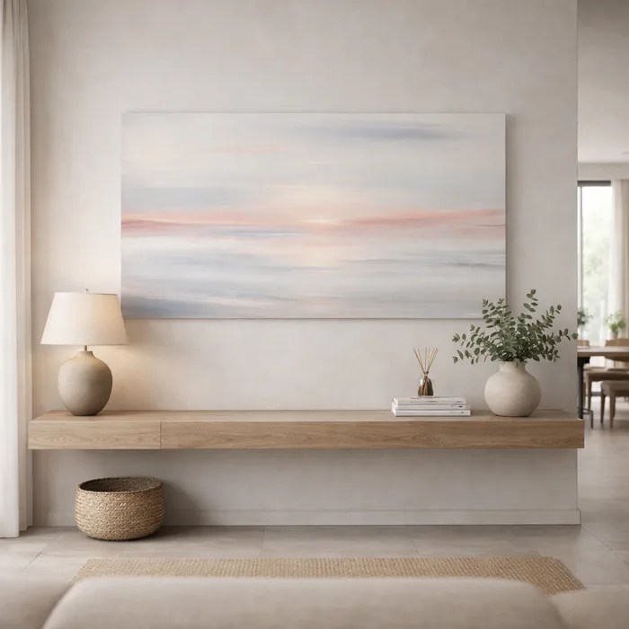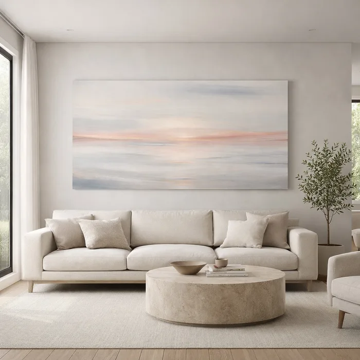 תמונת הקנבס משלבת נוף אבסטרקטי רך בגוונים רכים ונעימים ליצירת תחושת רוגע, מרחב ואלגנטיות.